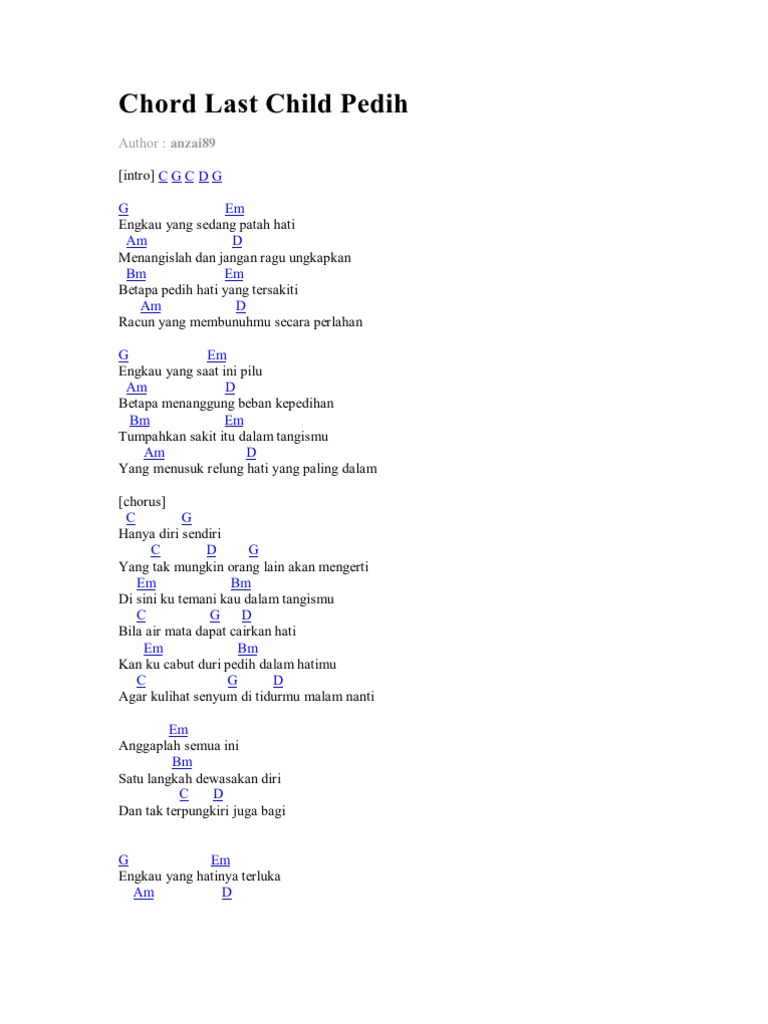 Pedih chords by last child. G em engkau yang sedang patah hati am d menangislah dan jangan ragu ungkapkan bm em betapa pedih hati yang tersakiti. Last child beranggotakan empat orang, yaitu virgoun (vokal & gitar), mamie (gitar), dimas (bass), dan ipank (drum). G em engkau yang saat ini pilu engkau yang saat ini pilu. Meamnangislah dan jangan ragu dungkapkan.